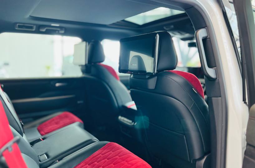 Legroom is 1,112 mm in the first row, 995 mm in the second, and 836 to 900 mm in the third row. This spacious interior is suitable for those looking for a comfortable monthly rental SUV.